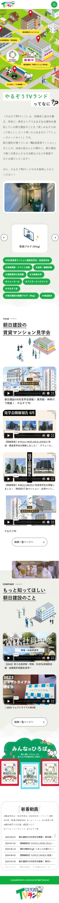 朝日建設のRC造賃貸マンションの見学会情報を動画を開催前後に配信したり、やるぞう君が参加したイベントの情報などや朝日建設の採用関連イベントなどをアウターブランディングの一環として配信しています。