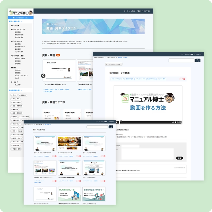 作成した教育・研修動画は、専用のプラットフォームを用意して活用することをお勧めします。マニュアル博士であればオリジナルデザインで動画配信プラットフォームを運営できます。